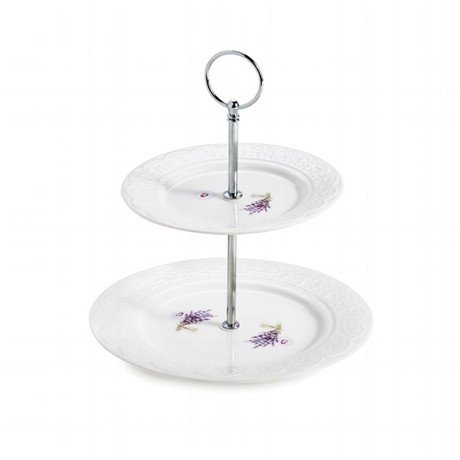Элегантная ваза для фруктов сочетает в себе оригинальный дизайн и функциональность. Два блюда разной величины расположены в два яруса. Каждое блюдо украшено изящной лавандой в центре и ажурным тиснением по краю. Такая двухъярусная ваза не только украсит сервировку стола, но и станет прекрасным подарком. Материал: фарфор Производитель: Nuova R2S SpA, Италия