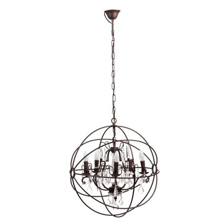 Темно- коричневая люстра - клетка, обрамленная металлическим шарообразным каркасом, с хрустальными подвесками и пятью подсвечниками элегантно впишется в любой современный стиль интерьера.