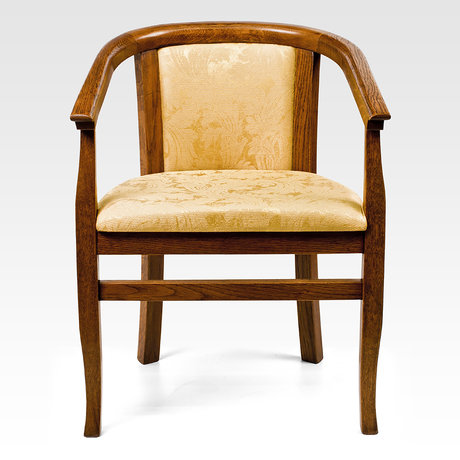 Деревянный стул с мягкой обивкой на каркасе из прочноно массива дуба. Спинка продолжена удобными подлокотниками. Модель одинаково гармонично будет смотреться как в спальной, так и в столовой зоне.