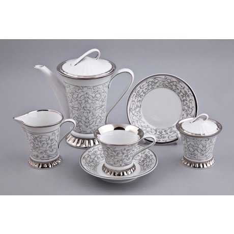 Сервиз чайный на 6 персон из 15 предметов, это удивительные чайные аксессуары, созданные в мастерской чешской фабрики Rudolf Kampf. Чайный набор выполнен из твердого фарфора и декорирован рельефными выпуклостями и платиной 950 пробы.