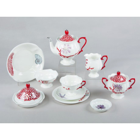 Яркие неровные линии кораллов на плавных изгибах белоснежного фарфора. Некоторому смягчению ослепляющего сочетания цветов послужили тонкие проблески натурального золота и полупрозрачные силуэты морских обитателей.