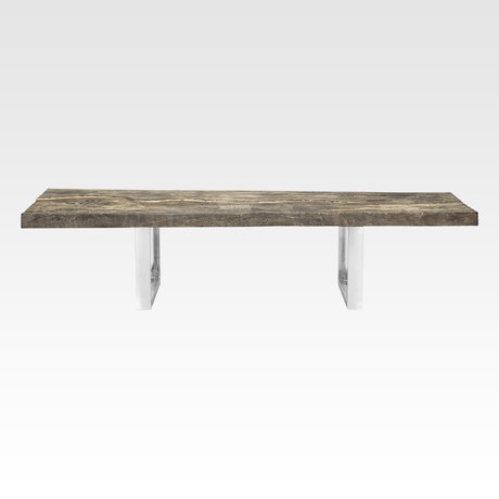 Журнальный стол / скамейка. Столешница изготовлена из цельного среза экзотического породы дерева - Trembesi wood, распиленная кривой линией по центру, поверхность обработана специальным образом создавая эффект каменной поверхности.