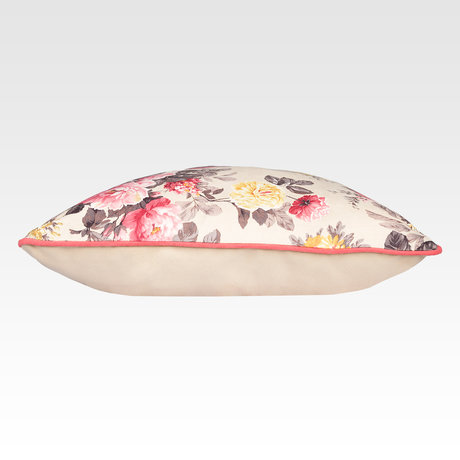 Декоративная подушка из микроволокна в романтическом стиле. Принт использует цветочные мотивы: пышные бутоны, обрамленные серыми листьями. Модель обрамлена розовым кантом. Для создания романтического настроения в интерьере.