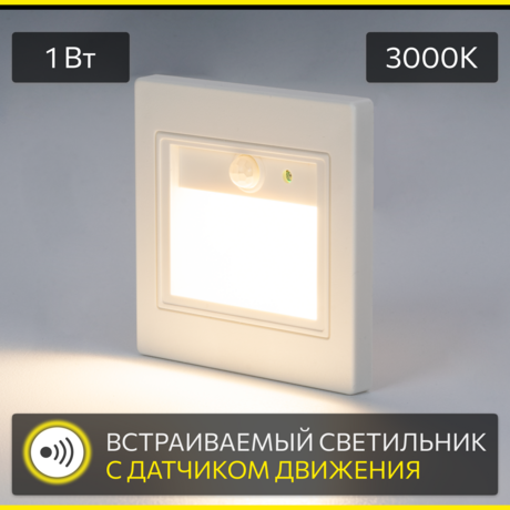 Изделие оснащено датчиком освещённости. Датчик движения действует на расстоянии 1-3м. Угол рассеивания света 90°. Время задержки отключения 25-35сек. Мощность светильника 1Вт, цветовая температура 3000К – тёплый свет.