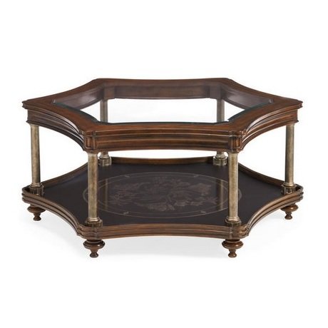 Коктейльный столик в форме шестиугольника в отделке Bridle и Emily Black. Отличительной особенностью этого резного шестиугольного стола является прозрачная вставка из стекла, позволяющая лицезреть уникальную ручную роспись на нижней панели.