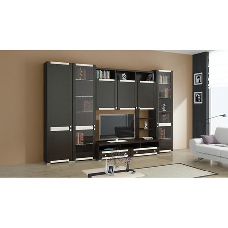 Уютная гостиная с набором самой необходимой современной мебели в приятной цветовой гамме: каркас выполнен в благородном цвете венге цаво, а фасад имеет два оттенка - венге цаво и комби. В состав набора входит: шкаф высокий с глухими дверями - 1 шт., шкаф высокий со стеклянными дверями - 2 шт., шкаф навесной большой с глухими дверями - 1 шт., полка большая - 1 шт., тумба большая - 1 шт., секция открытая малая - 1 шт.