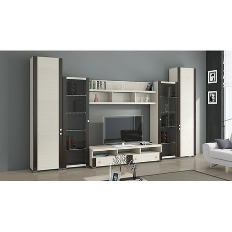 Уютная гостиная с набором самой необходимой современной мебели в приятной цветовой гамме: каркас выполнен в благородном светлом оттенке дуб белфорт, а фасад имеет два оттенка - дуб белфорт и комби. В состав набора входит: шкаф высокий с глухими дверями - 2 шт., полка большая - 2 шт., тумба большая - 2 шт., шкаф низкий со стеклянными дверями - 2 шт.