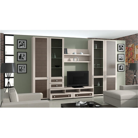 Уютная гостиная с набором самой необходимой современной мебели в приятной цветовой гамме: каркас выполнен в благородном светлом оттенке дуб белфорт, а фасад имеет два оттенка - дуб белфорт и каналы дуба. В состав набора входит: шкаф высокий с глухими дверями - 2 шт., шкаф высокий со стеклянными дверями - 1 шт., полка малая - 2 шт., тумба большая - 1 шт., шкаф-надстройка с ящиками - 1 шт.