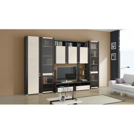 Уютная гостиная с набором самой необходимой современной мебели в приятной цветовой гамме: каркас выполнен в благородном темном оттенке венге цаво, а фасад имеет два оттенка - дуб белфорт и комби. В состав набора входит: шкаф высокий с глухими дверями - 1 шт., шкаф высокий со стеклянными дверями - 2 шт., шкаф навесной большой с глухими дверями - 1 шт., полка большая - 1 шт., тумба большая - 1 шт., секция открытая малая - 1 шт.