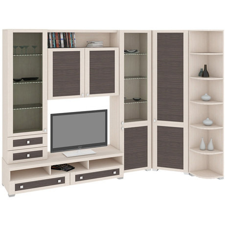 Уютная гостиная с набором самой необходимой современной мебели в приятной цветовой гамме: каркас выполнен в благородном светлом оттенке дуб белфорт, а фасад имеет два оттенка - дуб белфорт и каналы дуба. В состав набора входит: шкаф высокий комбинированный - 1 шт., шкаф навесной малый с глухими дверями - 1 шт., полка малая - 1 шт., тумба большая - 1 шт., шкаф угловой - 1 шт., стеллаж торцевой - 1 шт., шкаф-надстройка с ящиками - 1 шт.