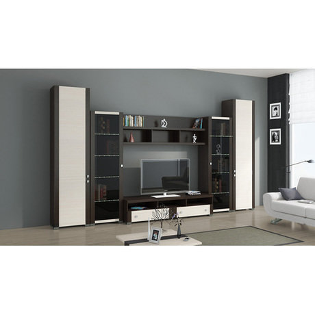 Уютная гостиная с набором самой необходимой современной мебели в приятной цветовой гамме: каркас выполнен в благородном темном оттенке венге цаво, а фасад имеет два оттенка - дуб белфорт и комби. В состав набора входит: шкаф высокий с глухими дверями - 2 шт., полка большая - 2 шт., тумба большая - 2 шт., шкаф низкий со стеклянными дверями - 2 шт.