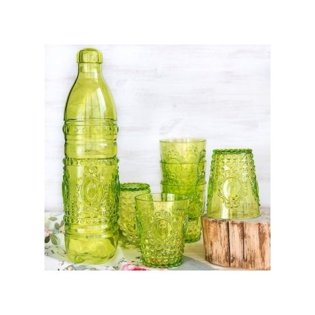 Изящный и легкий набор, состоящий из бутылки яркого салатового цвета и 6-ти стаканов для воды, создан для красивой подачи прохладительных напитков как в квартирах, так и на летних верандах загородных домов. Надежно сохранит ваш любимый лимонад или компот, благодаря надежной крышке с силиконовым уплотнителем.