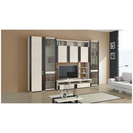Уютная гостиная с набором самой необходимой современной мебели в приятной цветовой гамме: каркас выполнен в благородном светлом оттенке дуб белфорт, а фасад имеет два оттенка - дуб белфорт и комби. В состав набора входит: шкаф высокий с глухими дверями - 1 шт., шкаф высокий со стеклянными дверями - 2 шт., шкаф навесной большой с глухими дверями - 1 шт., полка большая - 1 шт., тумба большая - 1 шт., секция открытая малая - 1 шт.