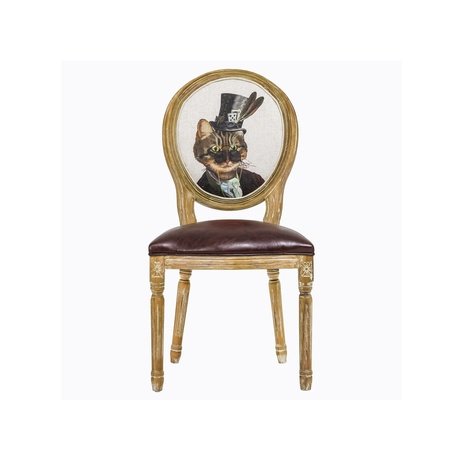 Стулья в стиле шебби-шик – не просто копия замшелой старины. Это особое настроение и абсолютно новая подача привычных вещей. Смелая комбинация ретро и ультрасовременного стиля поп-арт? Почему бы и нет! Каркас этого стула выточен из цельного массива и искусственно состарен. Обивку из эко-кожи не так легко испачкать, а вот почистить – не проблема. На спинке – принт с изображением усатого и полосатого господина в цилиндре. Вес стула равен 7 кг.