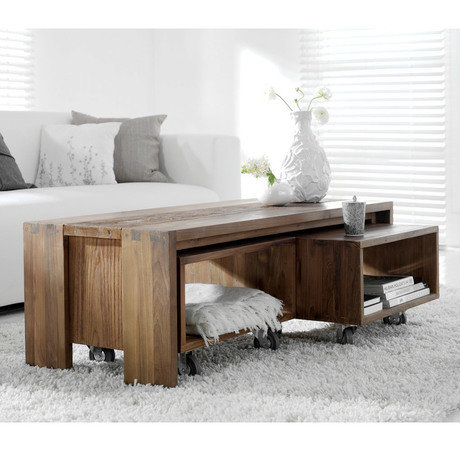 Журнальный стол из тика. Все модели дополнены элементами на колесах, что делает эту модель более удобной, чем обычный журнальный стол.Возможен в трёх размерах: 65, 120 или 180 см.