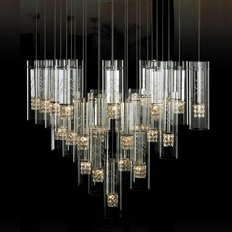 Подвесной светильник с 25-тью плафонами из коллекции Decollo на металлической хромированной арматуре. Плафоны снаружи выполнены из прозрачного стекла. Декор: хрустальные подвески черного цвета. Высота светильника регулируется до 200 см.