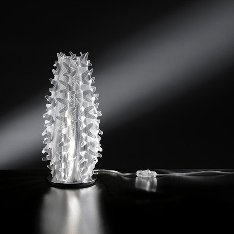 Настольная лампа CACTUS XM с оригинальным дизайном. Плафон прозрачного цвета выполнен из необычного материала под названием LENTIFLEX. Это материал, изготавливаемый по собой технологии, которая делает его поверхность «многогранной», как будто бы он сделан из многих маленьких призм. Благодаря наложению двух слоев материала с углом наклона в 0,15 градусов, LENTIFLEX, как вода, изменяет свою форму и цвет с разных точек наблюдения. Основа материала позволяет получить эффект Френеля: пропускает свет, но, в то же время, преломляет его, увеличивает яркость источника света, предотвращая при этом ослепление и создавая переливающиеся цветовые оттенки. Дизайн: Adriano Rachele.