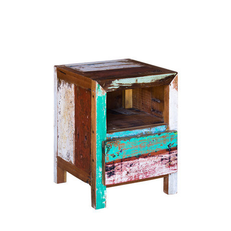 Тумба, выполненная из старой рыбацкой лодки с сохранением оригинальной многослойной окраски.