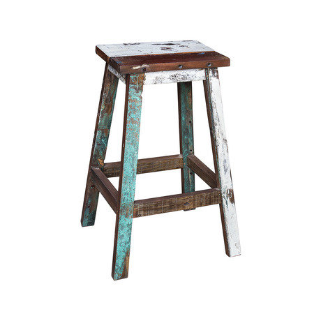Стул барный, выполненный из массива древесины старого рыбацкого судна, такой как: тик, махагони, суар, с сохранением оригинальной многослойной окраски.